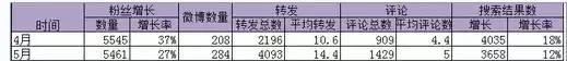 从这个表中可以看到4、5月的增长情况,两个月的粉丝增量差不多,微博信息数量5月增加36%,但是转发总数增长近100%倍,评论增长了64%,搜索结果数也是增加了。应该说针对4月的微博内容分析之后,5月份作了一些调整,更加注重用户需求,所以在总量增加的同时微博的平均转发数和回复数都上升了,可以说明该微博5月份比4月份是有进步的,而且搜索结果数直接增加曝光率,说明了营销效果。
