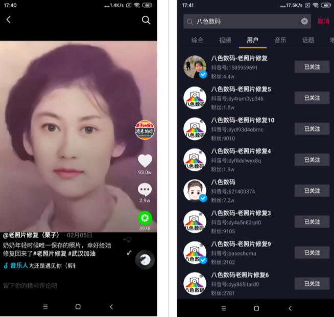 其中,@老照片修复(栗子)的一个模糊老照片修复视频达到了93W赞,3W的评论;更有@八色数码,做了20多个矩阵号专门来做老照片修复。