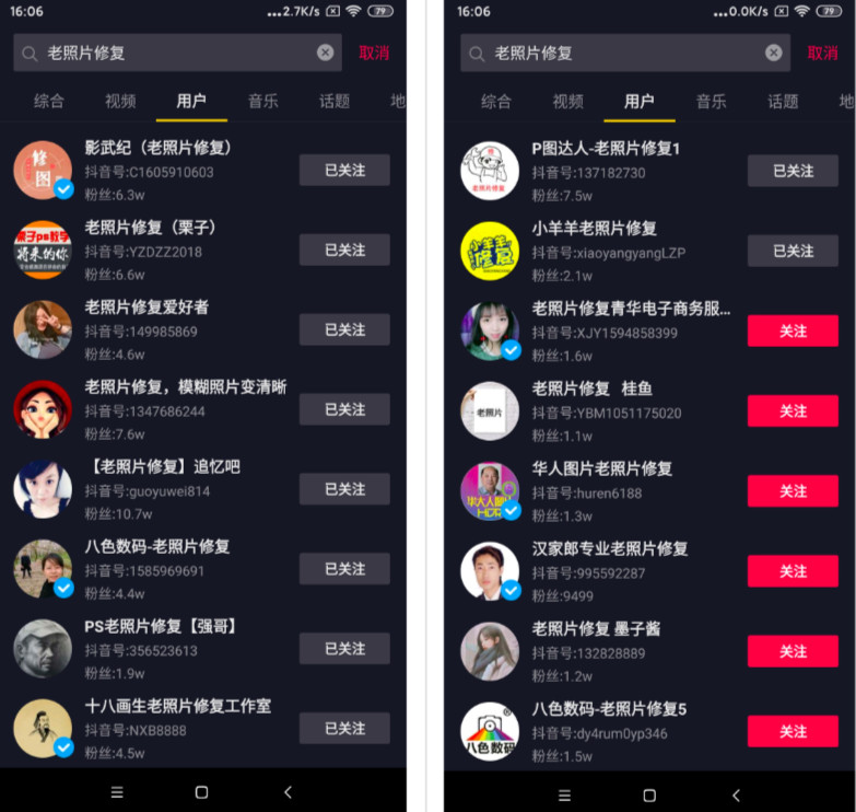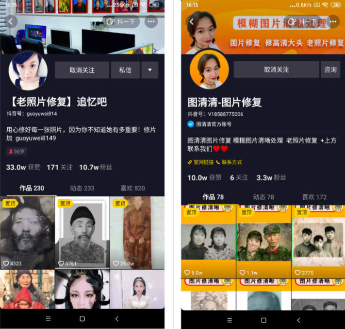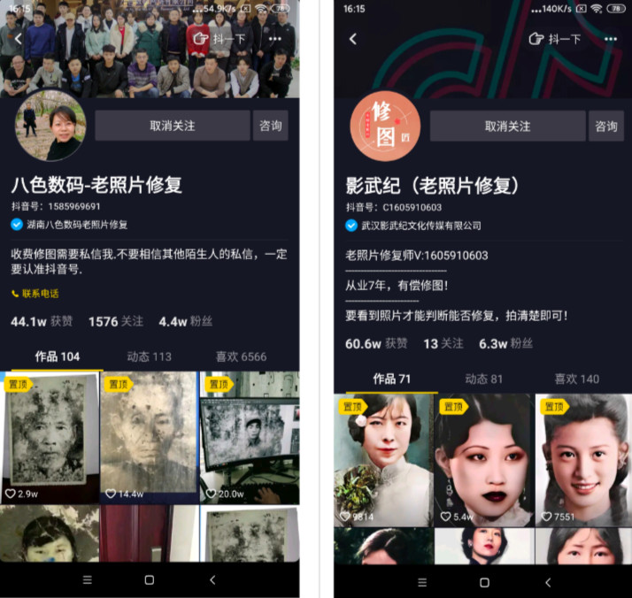 大部分抖音名中,都会含有“老照片修复”关键词,方便用户搜索和记忆。