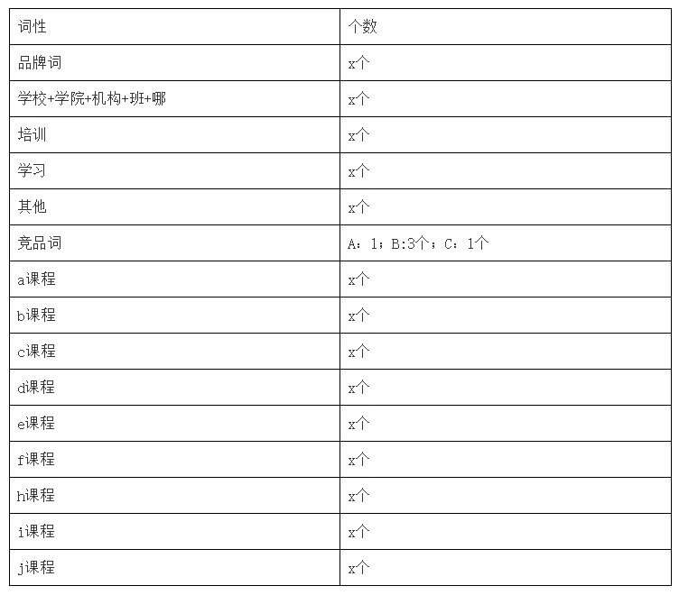 8)关键词量:包含品牌词、竞品词、产品词、通用词、行业词、人群词、暂无活动词(如寒暑假搞活动,价格折扣等。)