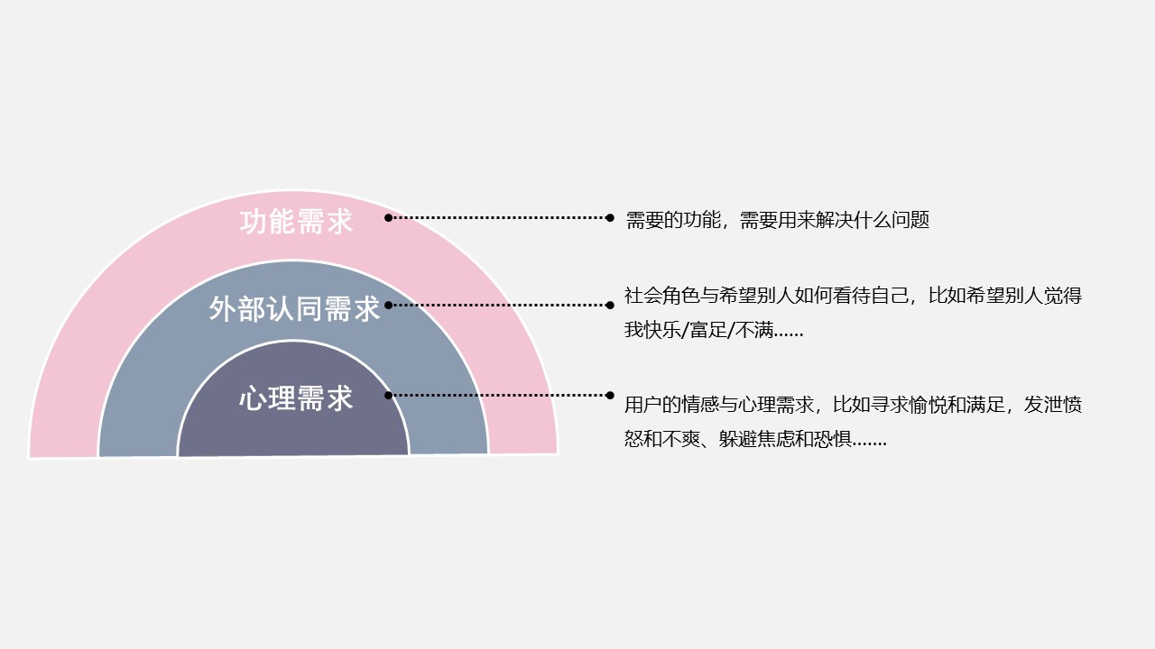 这个是我以前总会用到的分析模型,将需求分为三个维度,分别是最深层的心理需求,再往上一层是外部认同需求,最表层是功能需求。