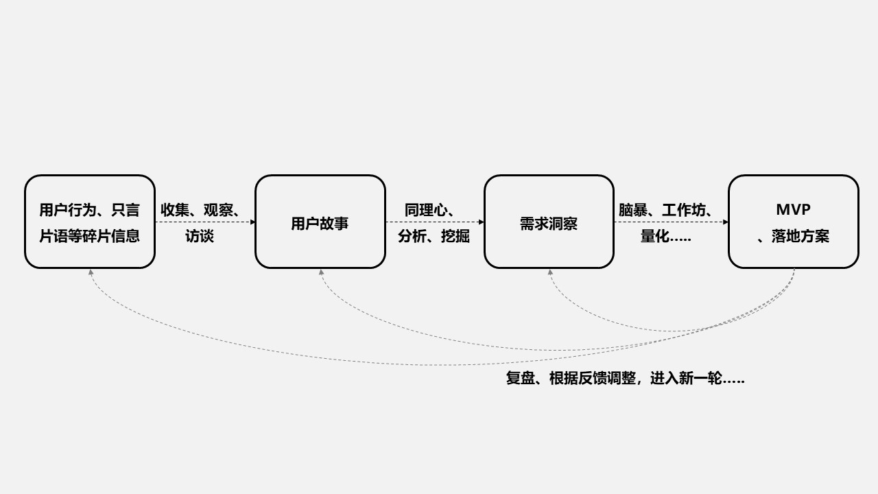 比如通过数据挖掘和数据分析这些定量的方式提炼出用户的完整故事;也可以通过访谈等定性的方式和用户聊出来;当然还有更简单的,就是带着用户视角和自己的专业经验直接观察,但是这种方式要注意控制自己的偏见,或者有时观察的结果其实会被自己的经验带偏,还是有些难度的。
