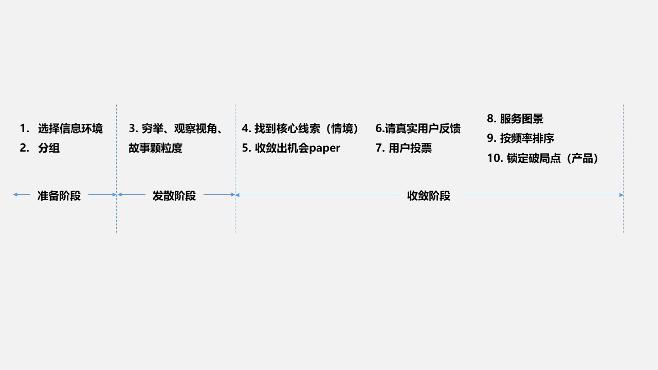 这种方法偏定性一些,而且基本是比较有经验的产品经理和研究人员为主导,在前期准备、发散和收敛前期都是依靠自己人员的专业经验来洞察机会点,直到收敛后期才请用户参与进来,帮忙做反馈和筛选。
