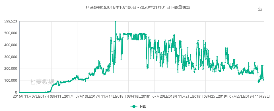 从下图中的数据来看,抖音的发展科分为三个阶段:产品打磨期(2016年9月到2017年2月,下载量是千量级),运营驱动的高速增长期(2017年3月到2018年1月,从千量级高速增长到千万量级),产品自增长的稳定期(2018年至今)。