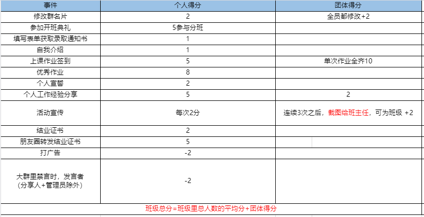 在本文的前面,就有提到本次活动的班级管理是采用积分制的,为了让大家看的更清楚,这个位置,我再发送一下积分制度表: