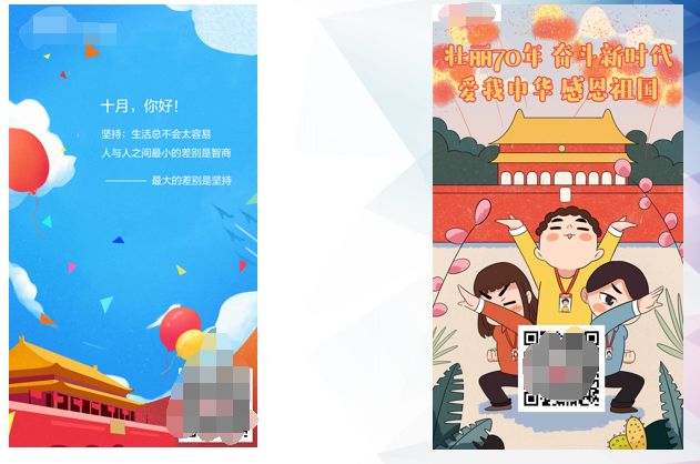 值得注意的是,在积分中,为了结合国庆,我特意加了一个活动宣传作为学员增加积分的环节,学员可以在课程期间,转发我们的国庆宣传海报获得积分,为了测试效果,我们做了3张国庆品宣海报,过程中发现效果还是很不错的。大部分的学员为了获取积分用于参与转发,后面我会详细说下,这块之后将如何改进,以下是其中2张: