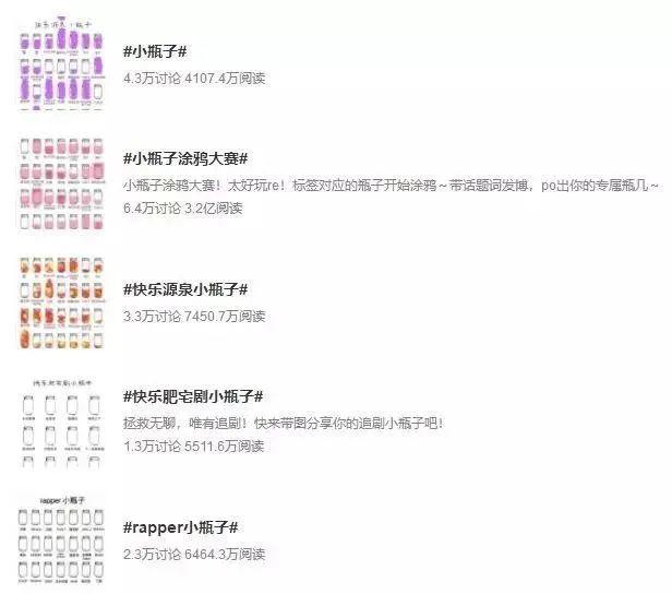 春节期间,#小瓶子涂鸦大赛#火爆全网,相关话题在微博热搜阅读达到3.5亿,讨论7.5万,无论是微博还是朋友圈,大家都在晒自己的小瓶子。