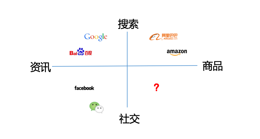 如果用搜索、资讯、商品和社交来表现当前巨头们所在的模块,社交和商品的象限里还是一片空白。