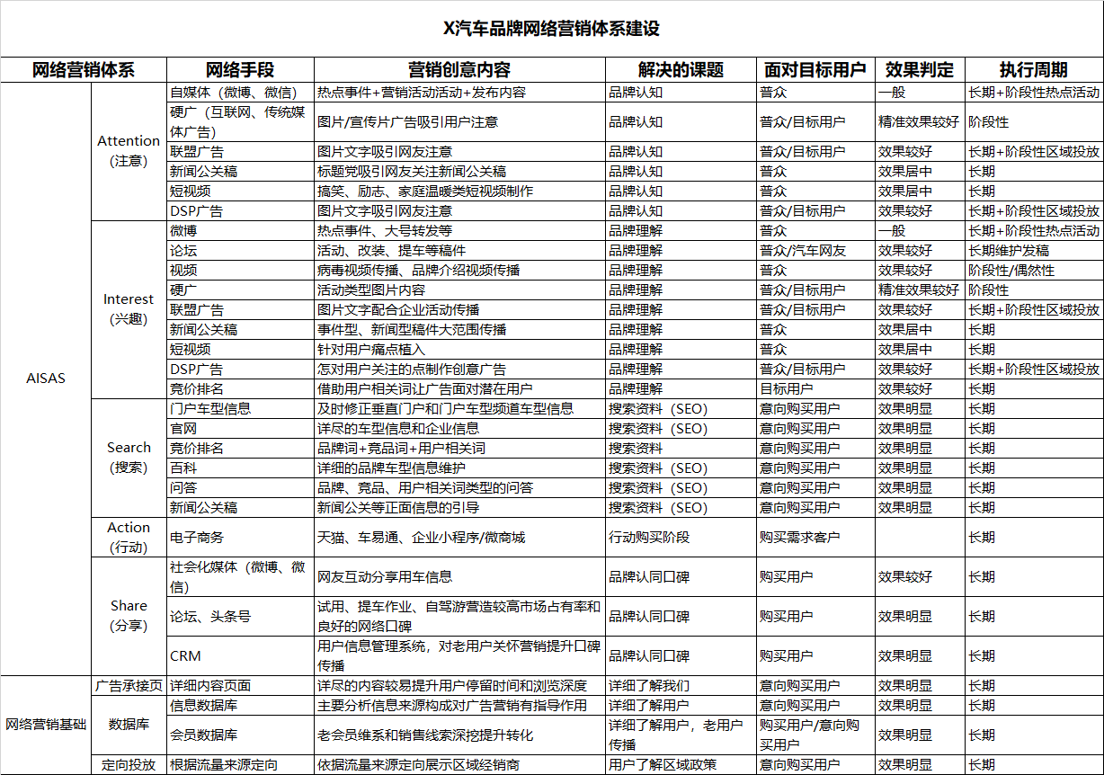 互联网时代将人们的购买习惯由AIDMA模式过渡到了AISAS模式,2013年做营销总监服务某汽车品牌的时候,曾经将互联网营销的不同渠道和不同营销创意融入AISAS模式的各个阶段,针对现在的短视频做了些优化分享给大家。