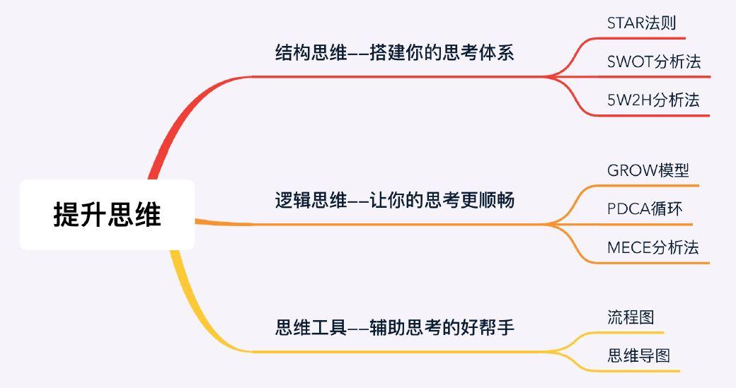 逻辑思维是人们对事务进行观察、比较、分析、判断和推理,从而对认识目标形成自己的框架结构,并准确而有条理地表达出来的能力。可以借助GROW模型设定目标,寻找解决方案,使用PDCA循环保质保量,采用MECE分析法用于头脑风暴。除此之外,还可以使用流程图和思维导图辅助思考。