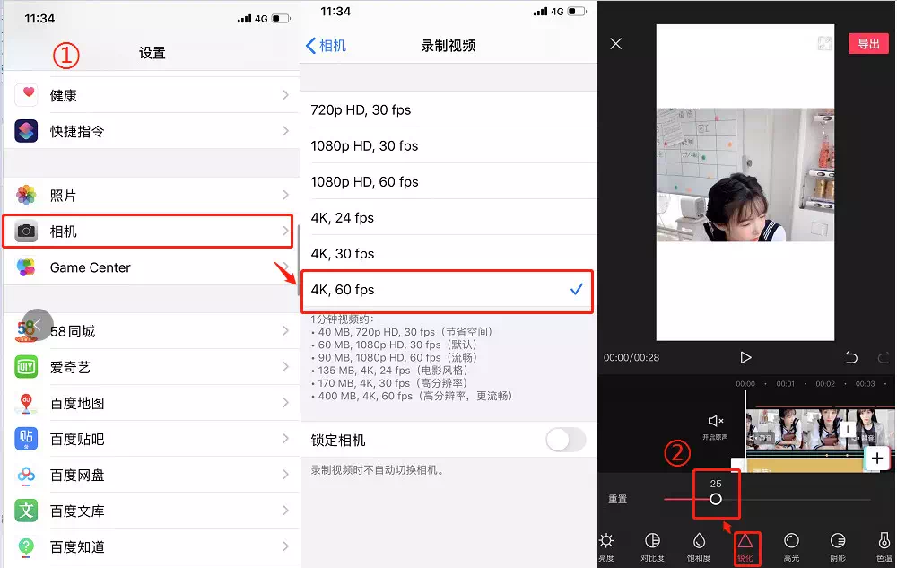 ①打开“设置”找到“相机”,把录制视频的分辨率改成“4K,60fps”。