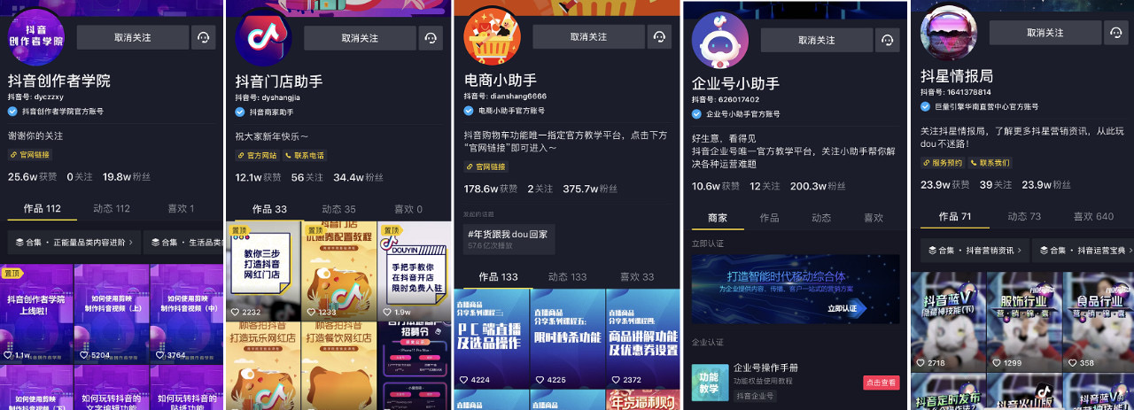 巨量课堂、电商小助手、抖星情报局、企业号小助手、抖音门店助手、抖音创作者学院。
