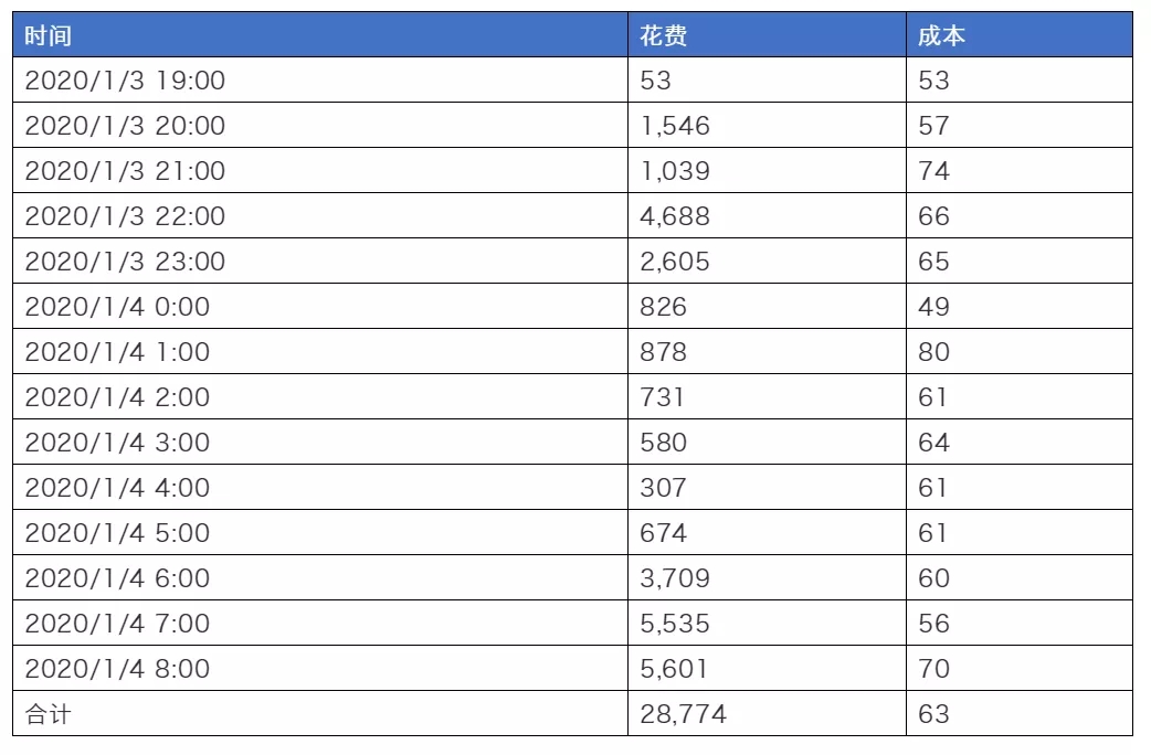 目标转化成本40元,但是账户花钱困难,优化师将出价提升至60。按照以往的经验,即使提价账户消耗也比较慢,可以边消耗边降价,就和往常一样、没有设预算。这个组当天晚上19点开始花钱,第二天早上8点起来看账户,已经花了近3万块钱,意外地爆量了。转化成本是63,是目标成本的1.5倍。