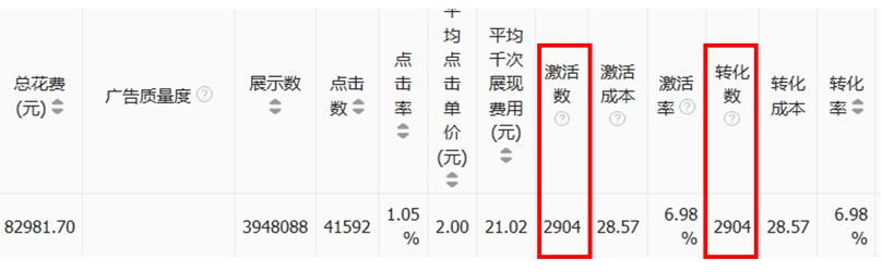 出价也是按照注册的要求来出的,当天晚上直接爆量、消耗了8万元。第二天做数据的时候发现激活数和转化数怎么一样呢,才怀疑是不是转化目标选错了。