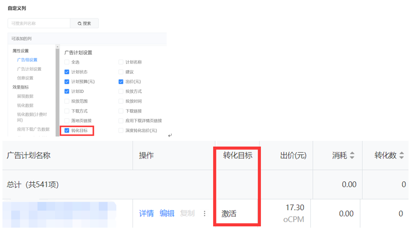 另外有一个小的建议,在计划层级“自定义列”的选项中,勾选“转化目标”这一项,这样可以在计划层级直接看出转化目标选的是什么,不用到转化跟踪那才能看,有误选的情况能早点发现。