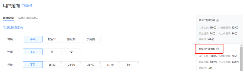 另外,选完定向之后,可以看一下预估用户覆盖数,看人群量级对不对,比如不限制定向的话应当是亿级的,结果这次只有几十万,就得回头看一下、是不是有弄错的了。跟检查作业似的。