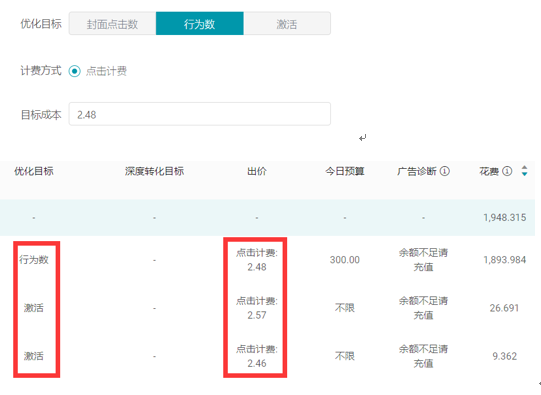 广告主要求激活成本2元,正常要将优化目标选成“激活”,优化师误选成了“行为数”,并且按照激活成本来出的价,花了1893元时被发现,激活成本是目标的50倍。
