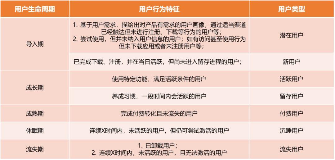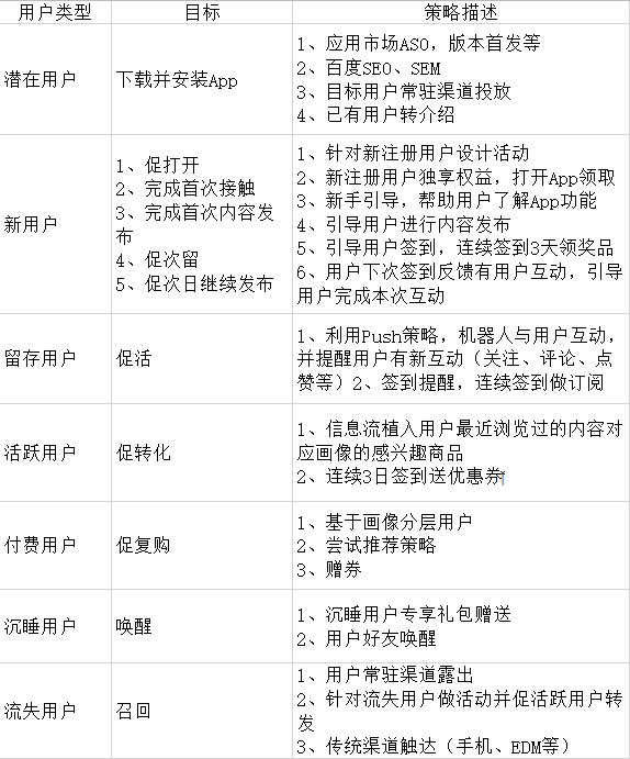 譬如说,如果要做用户运营策略,那我们就需要先去定义用户的类型,下面这张图是以App为例子,去做用户定义的一个参考图。