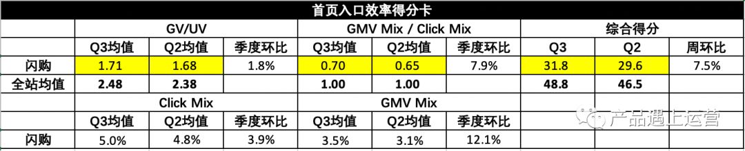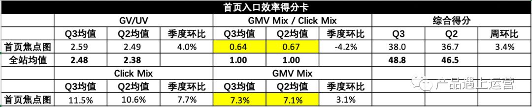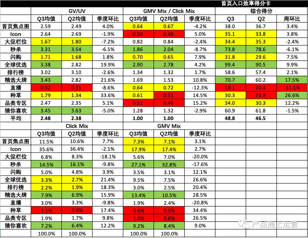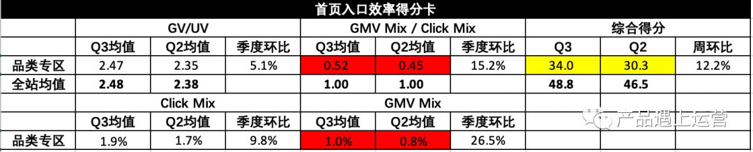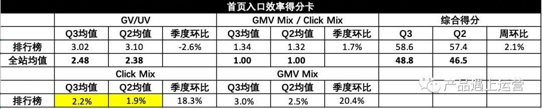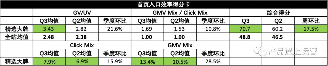 观察:这是个品牌维度的导购频道。相比上方紧邻的频道有大幅的流量提升,获取流量能力极强,说明消费者喜欢在品牌维度浏览。同时销售效率超越全站水平较多,仅次于全球优选和秒杀,销售占比上表现抢眼,说明频道设计优秀。此外,值得注意的是,它的综合得分相比二季度有大幅提升,主要是引导消费者看更多商品的能力大幅提升,这可以进入频道页分析原因。
