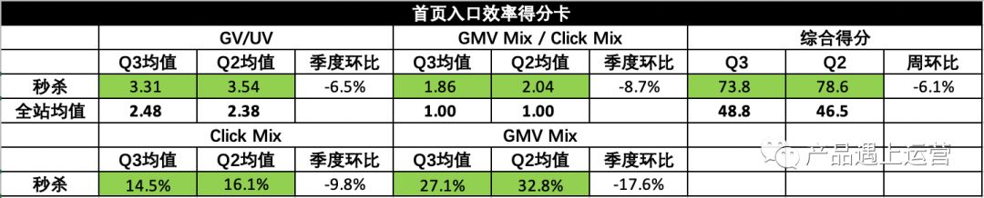 观察:作为非常设栏位,数据体现的大促栏位流量抓取能力合理。Q2流量高于Q3,可能是因为二季度大促多于三季度,或促销主题更匹配主力客群。人均GV表现偏弱,说明主会场没逛起来。销售效率略低于全站均值。