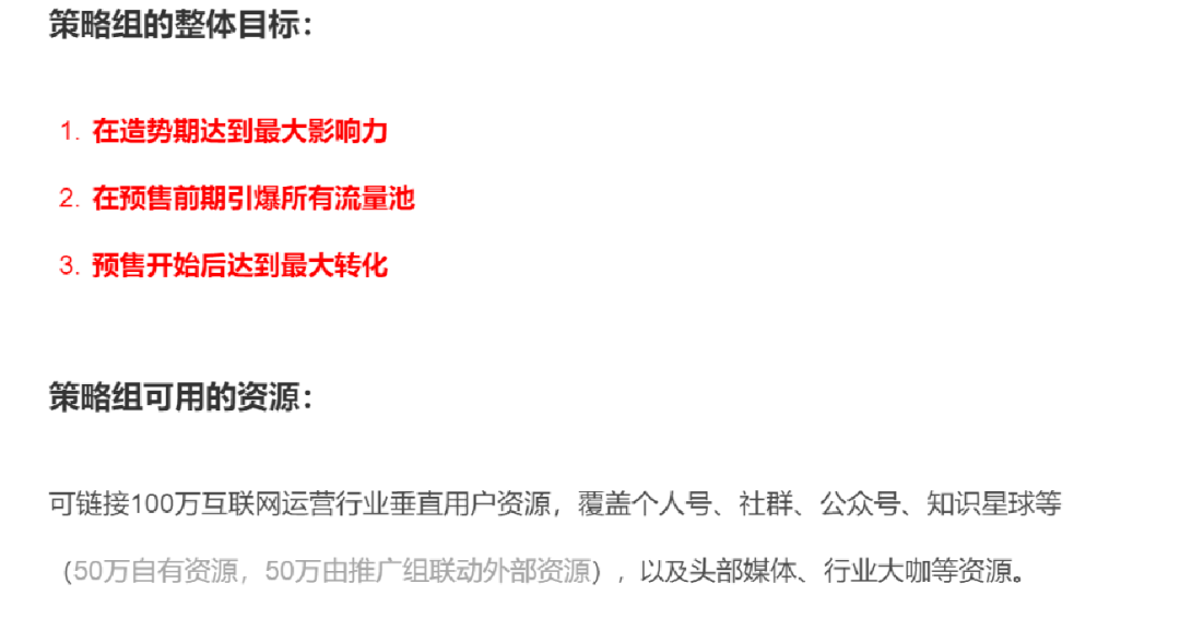从上图可以看到,我们开始拿到的目标是模糊的,只有简单的描述以及介绍了部分可用资源,但我们需要找到最重要的一个目标,并且是可以带动另两个目标的实现,在这里你可以理解为北极星指标。也就是最直接的,可量化的销售额。所以我们直接选定鸭头在朋友圈发布的100W作为直接目标。