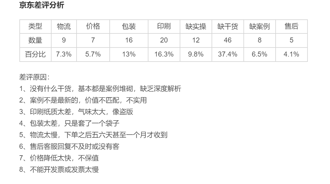 当有了用户画像,我们就需要思考,我们的产品满足了用户的哪些需求,因为是爆款案例库,最直观的体现载体就是“书”,因此我安排了团队分别寻找了当当京东等电商平台查看运营类书籍的评价数据,进行数据分析,来看看用户可能关注的点。