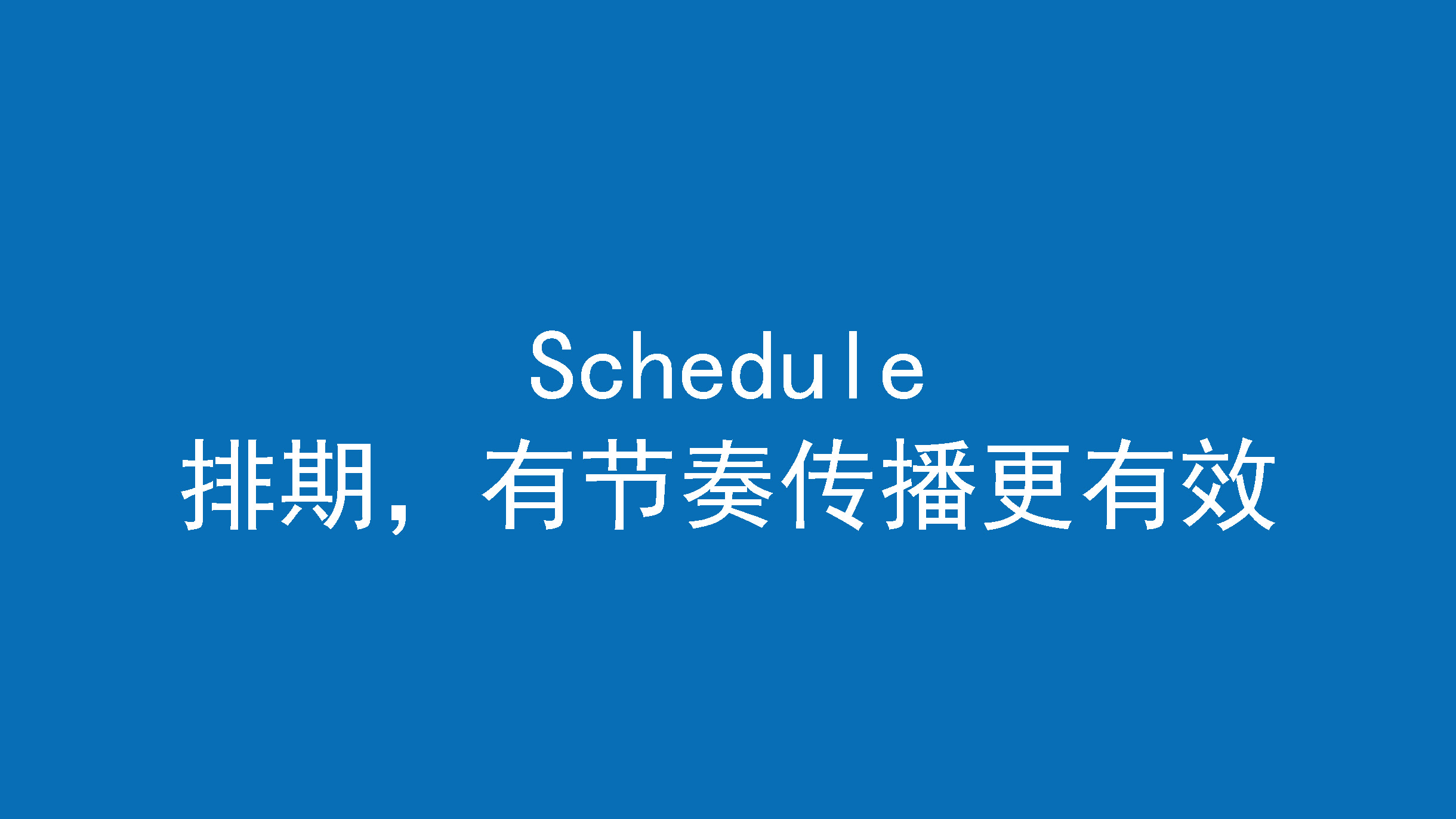 排期Schedule,也叫路线图roadmap,主要由时间轴、传播阶段、概念、创意和媒介5部分组成,既完整的总结包括所有传播信息,又清晰的规划传播时间节奏。通过预热、引爆、延续有节奏的传播,让传播最有效。