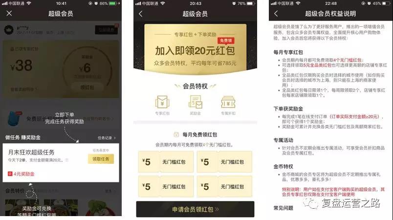 c、用户运营的留存KPI怕是很容易完成了,通过累计鼓励金兑换无门槛券,以及赠送的4张分日期无门槛券,更有累计多月价格优惠,会员卡到期提醒,下单付款环节植入等,将用户牢牢的圈在自己的盘子里,之前有过1个数据,当用户在1个平台连续下单7单以后用户习惯即可养成,换平台的成本就会很高,当然运营的同学肯定仔细研究过这个数字;