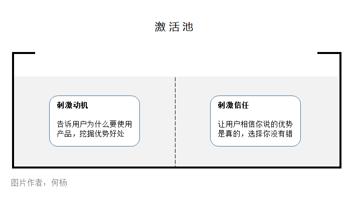 接着我们再分析产品,看看用户是否有足够的使用动机,如果没有,我们就把产品优势扔进激活池中的动机池!如果有,我们就扔进激活池中另外一个小池子信任池!