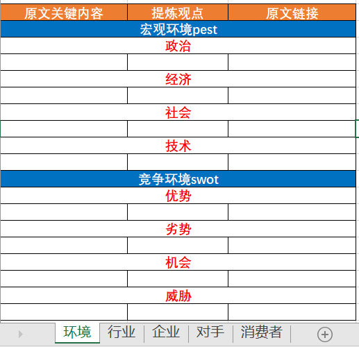 搜索前我们先搭好框架,年度传播案的话,一般会从环境、行业、企业、对手、消费者5个角度分析,细化到各个维度,环境又会分宏观环境pest和竞争环境swot去分析。然后我们再把原文关键内容copy进去,在提炼观点一栏写我们的观点或感受,最后附上链接。