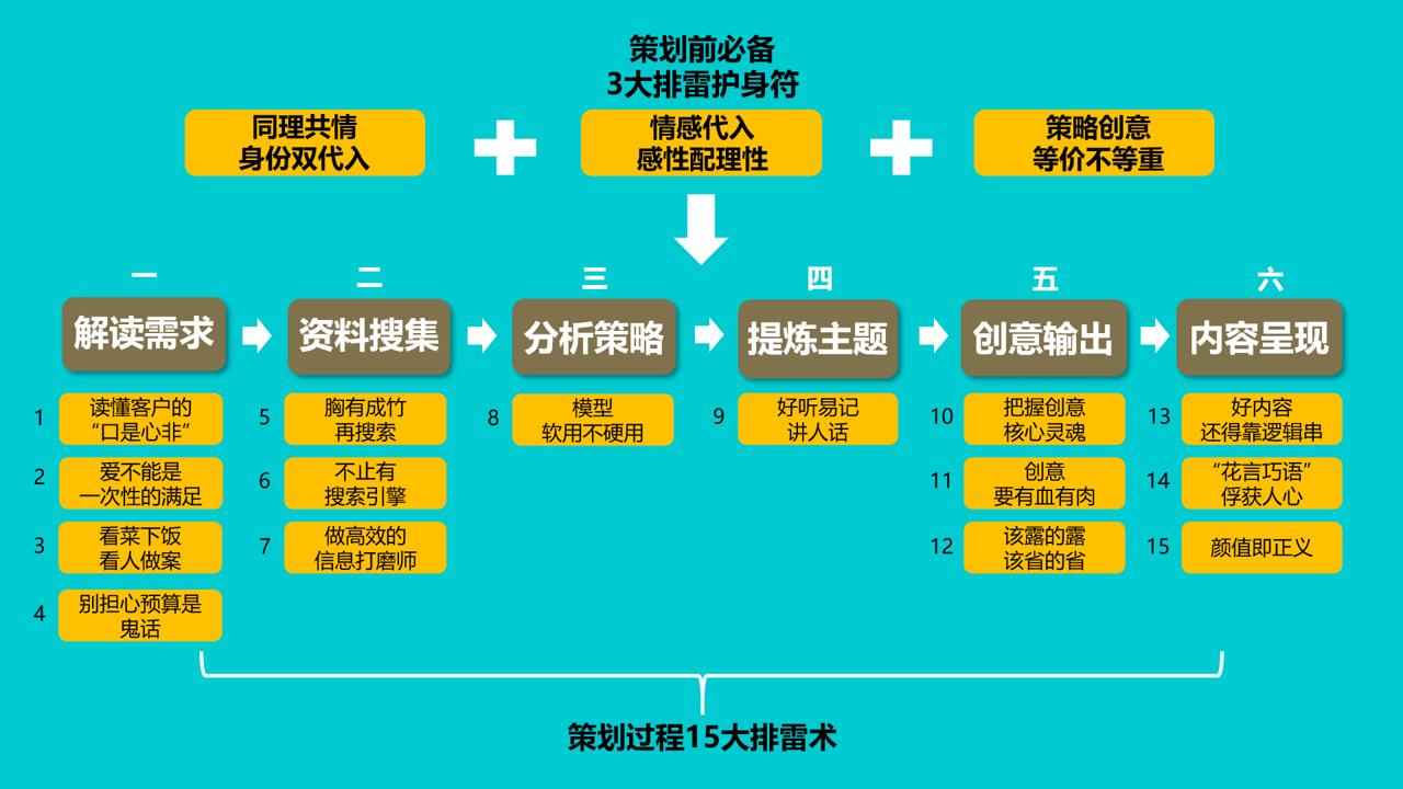 新手策划入行的“3大护身符+15招排雷术”实用技巧就都介绍完了,最后用一张图再来整体回顾一下: