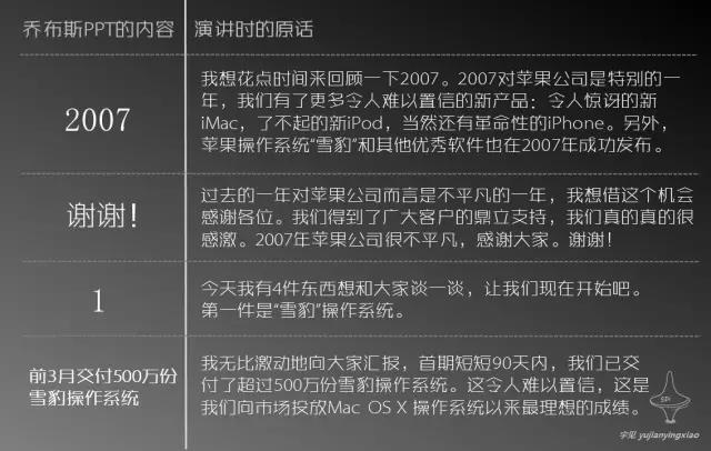 在公共关系方面,上图是乔布斯一次会议上的讲话与幻灯片内容。一共4页PPT,只有24个字符,我们同样可以感受到这种极致简洁的魅力。