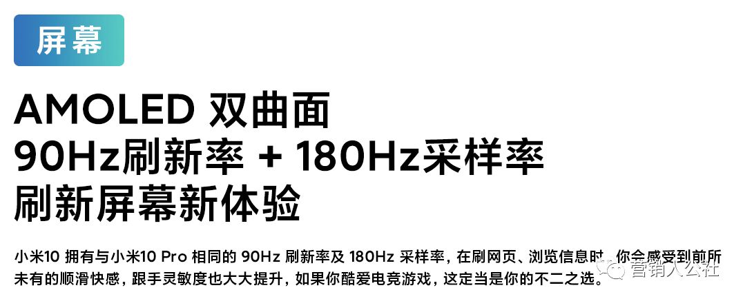 比如,同样是描述屏幕,小米手机 10 写的是各种参数: