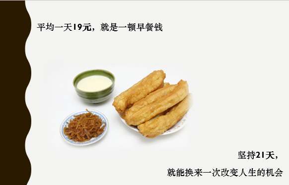 399元的课程,我们或许可以这样说,“平均一天19元,就是一顿早餐钱,坚持21天,就能换来一次改变人生的机会”。