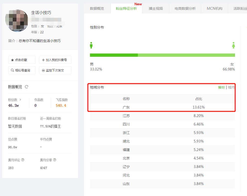 图中可以看出女性粉丝占6.5成,在广东的人最多。