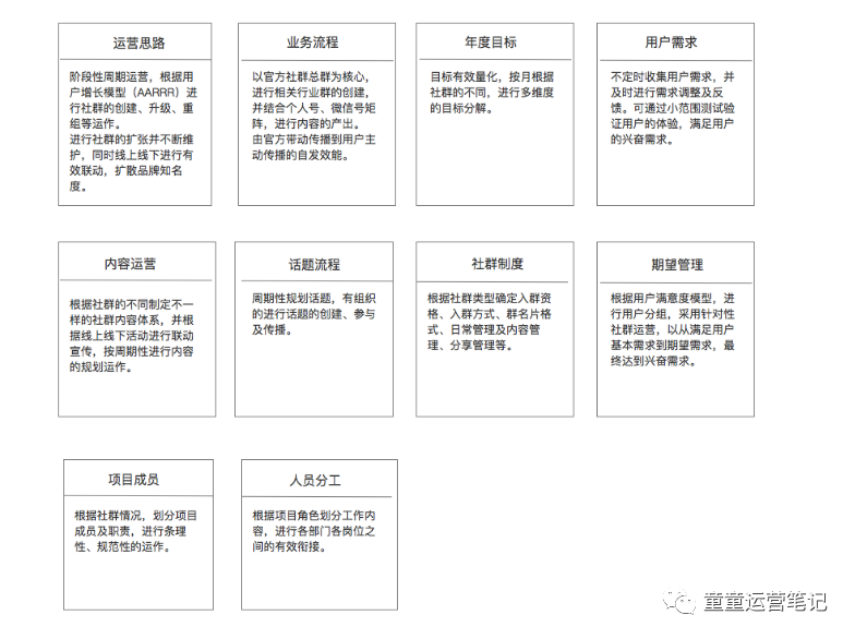 从运营思路、业务流程、年度目标、用户需求等十个方面进行社群项目的运营管理。