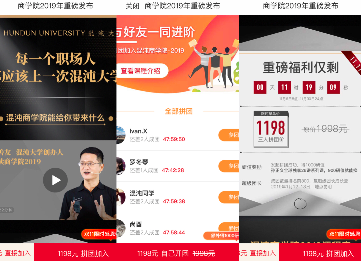当然,促销团购也用于低频或高客单价产品,比如混沌大学推出的2019年商学院,原价1998元,采用3人拼团后,降价近一半,让需要重度决策的产品吸引了更多用户加入。