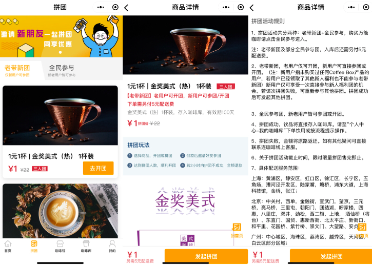 比如51talk的“1V1外教课”团购和连咖啡的老带新团,前者规定老用户可无限开团,新用户只能参团或开团1次,后者规定老用户仅能开团,新用户可参团或开团,但参与其他新人福利活动的新用户则没有资格。