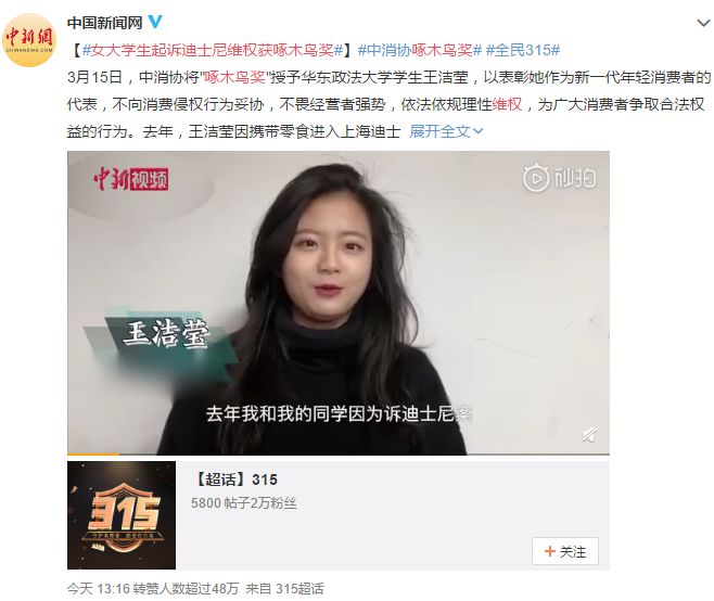 “啄木鸟奖”是中消协为鼓励消费者主动行使监督权、勇于揭露行业乱象设立并颁发的奖项,这次起诉上海迪士尼的大学生获奖,也是警醒企业行业要规范经营。