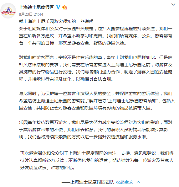 几个月后,事件由媒体报道引发大众热议,8月11日上海迪士尼“不知悔改”的对外回复犯了众怒,面对舆论质疑不及时回应公众最关心的问题,既不道歉也不认错。