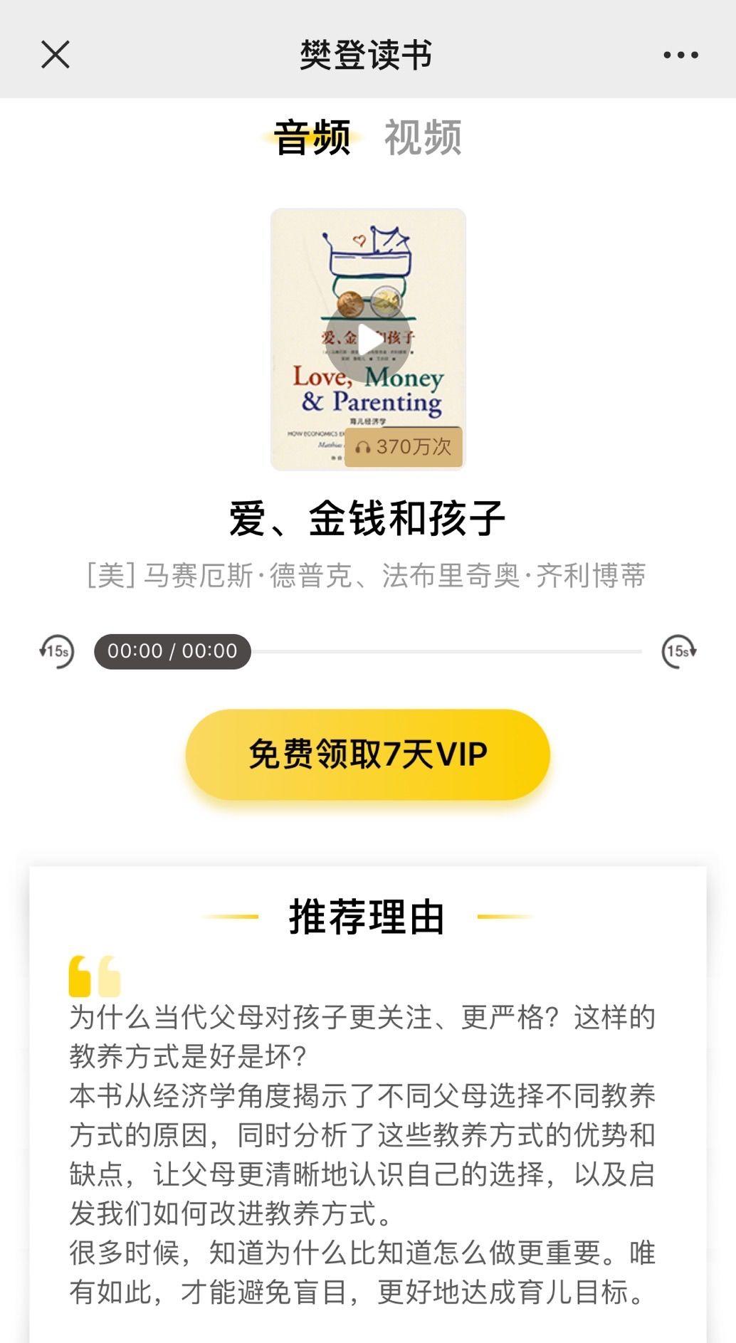 每个不知道樊登读书是什么的用户,可以免费领取7天vip会员,先听7天体验一下,感觉好了再购买。