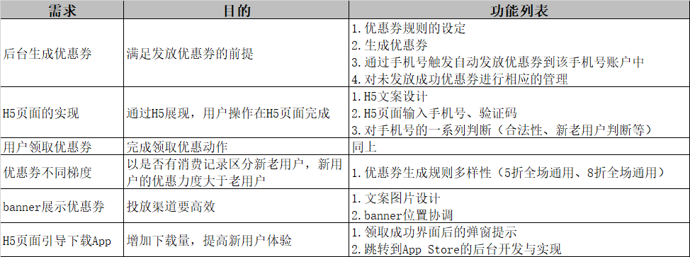 针对这种普遍的用户心理,结合用户当前的需求,整理出实现优惠券发放和使用功能的具体的功能点如下: