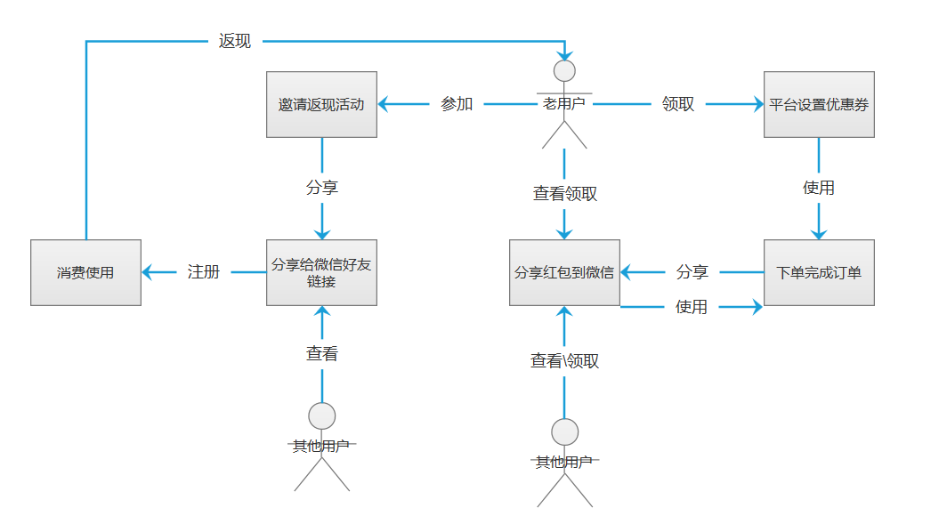 - 拉新手段之一,通过推荐新用户使用app,不仅新用户会获得红包,新用户在限时内消费后,推荐者也可以获取奖励金(拉新、简单粗暴、效果不明显)。