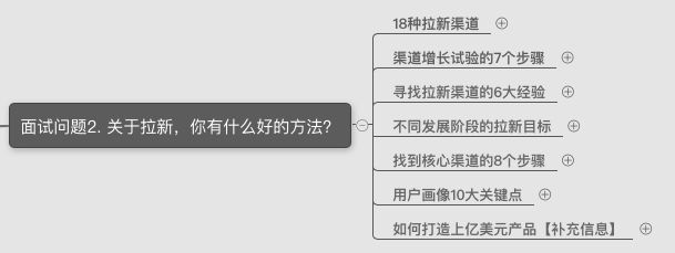 所以,任何一个问题,不要只知道皮毛,还要往下了解一层。展开脑图,挑选其中几个主要的拉新渠道,记住具体实施方法和步骤。