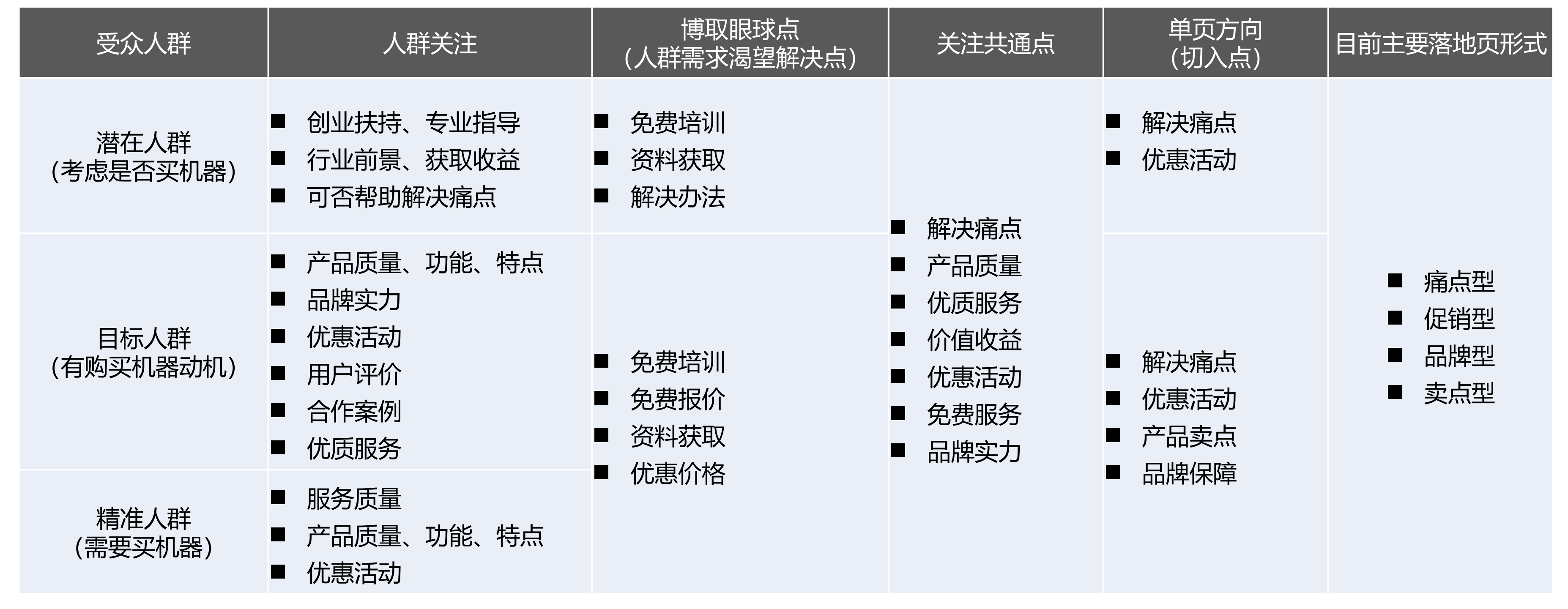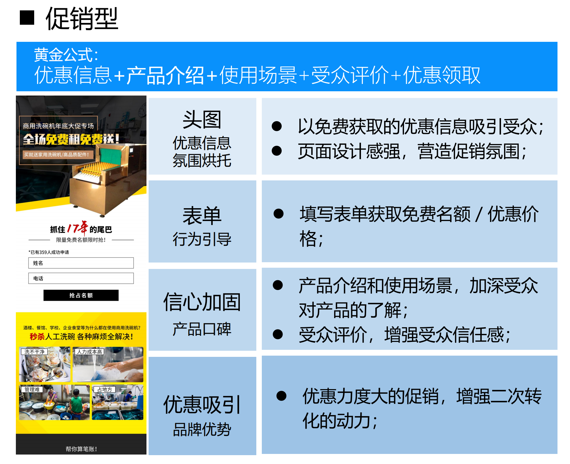 - 切入点:免费培训/报价等卖点,资料获取/优惠等活动,品牌保障等