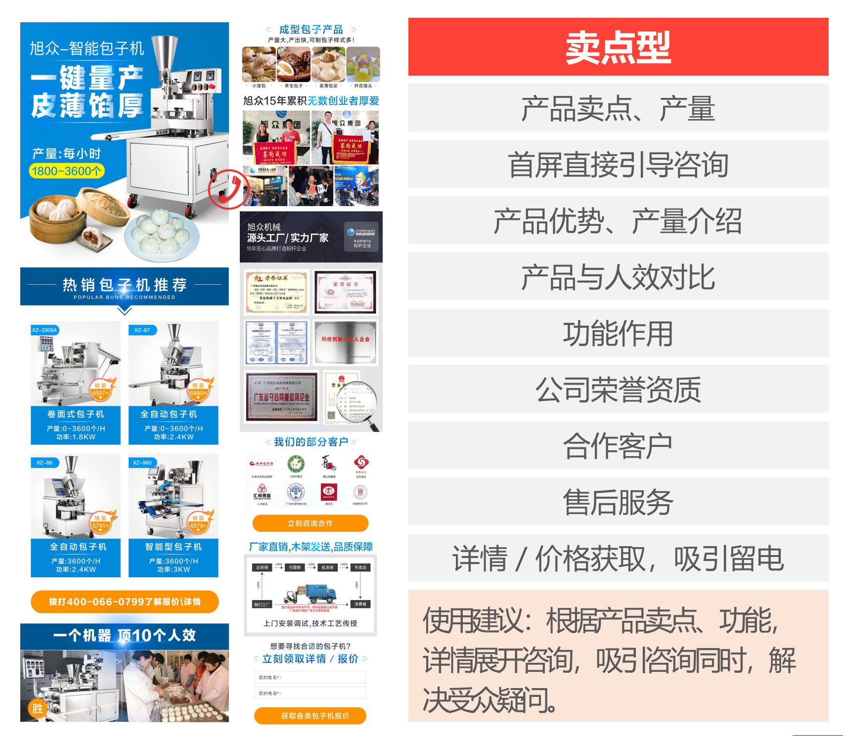总结来说,机械行业用户主要的关注点是:痛点、产品价值、产品卖点、质量、品牌实力、产品价格、活动、售后,所以,我们需要根据用户的需求进行定制化的营销页设计,打造出行业爆款。
