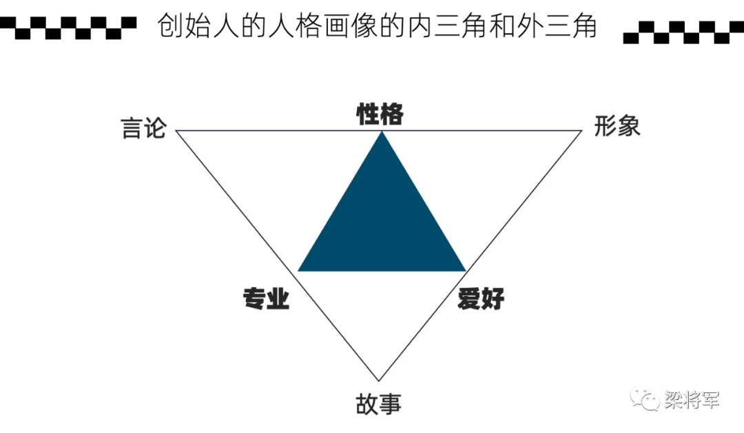 人物的内在三角和外在三角共同构成了创始人IP的人格画像。内三角要通过外三角才能有效传播出去,外三角必须依托内三角才能站稳脚跟。