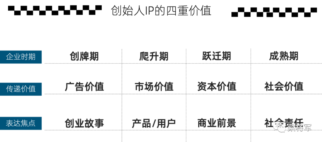 - 不要只盯着创始人IP的广告价值,要在企业不同阶段,挖掘它的市场价值、资本价值和社会价值;