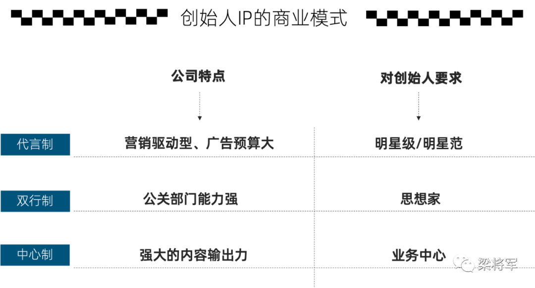 这三个人代表了三种不同的创始人IP打造方向,即代言制、双行制、中心制。