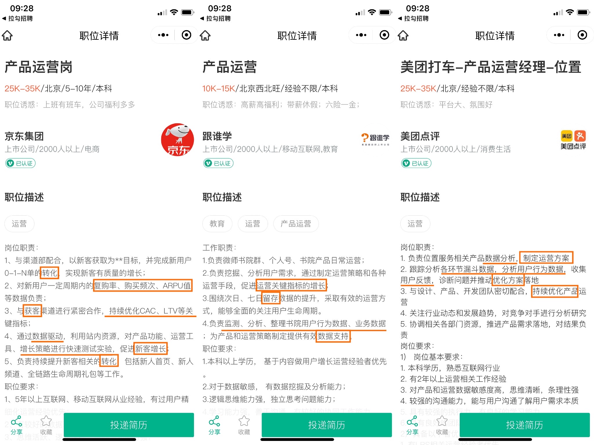 综合电商、教育、出行领域大厂的JD,不难提炼出产品运营岗的招聘需求关键词:制定整体运营方案、用户/客户增长、用户留存、购买转化率、数据运营。